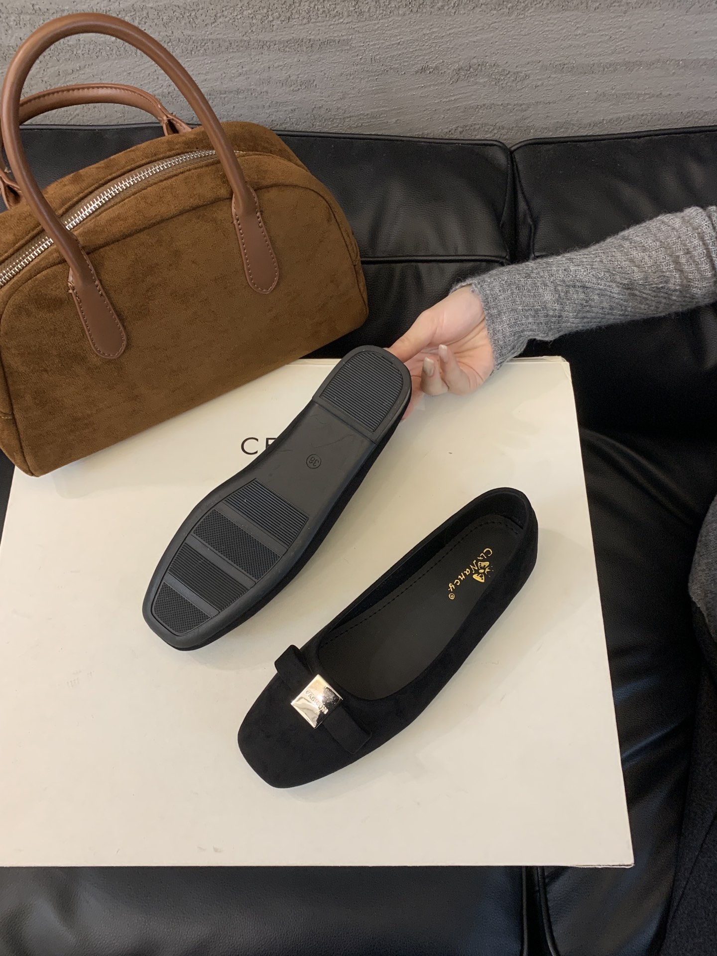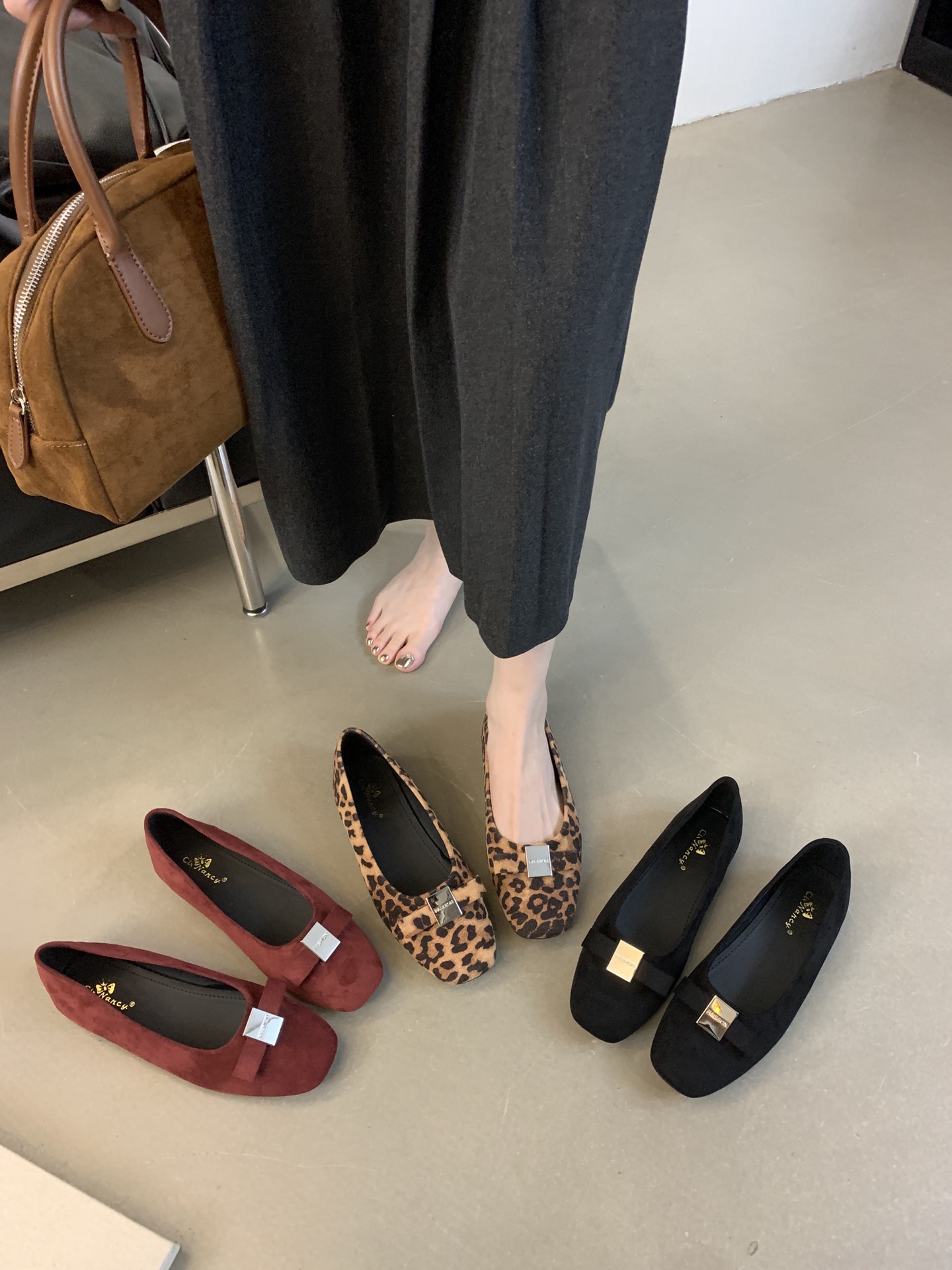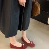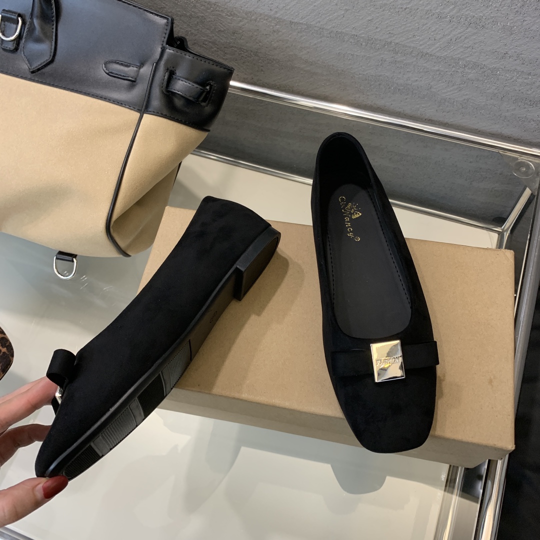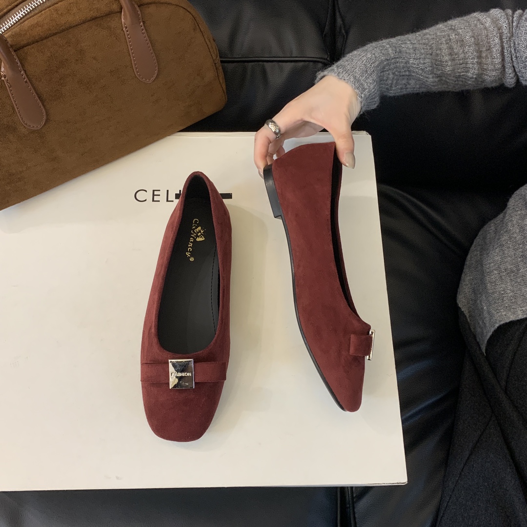 French-style square-toed bowknot metal buckle suede flat ballet flats for women