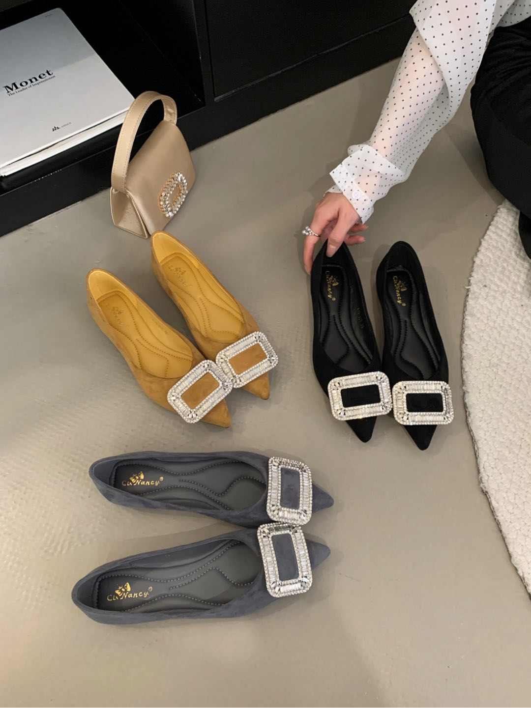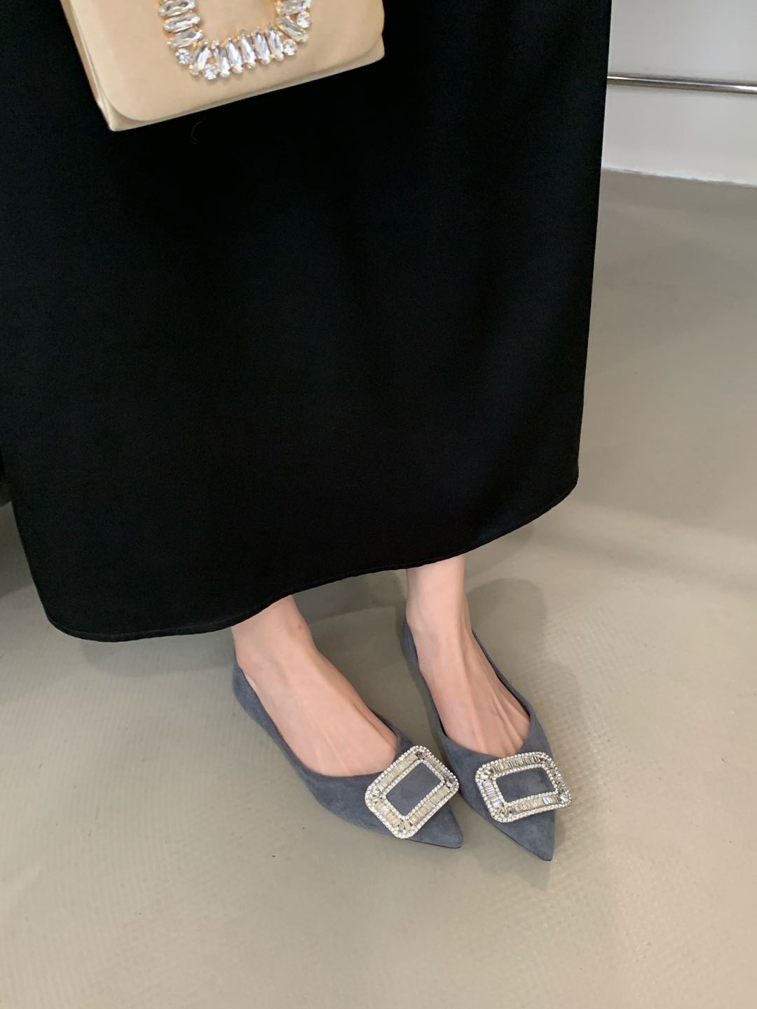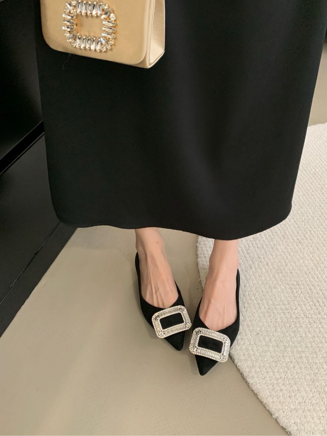 Elegant flat pointy-toe shoes adorned with rhinestones and a square buckle, perfect for a chic French-inspired commute 619-225