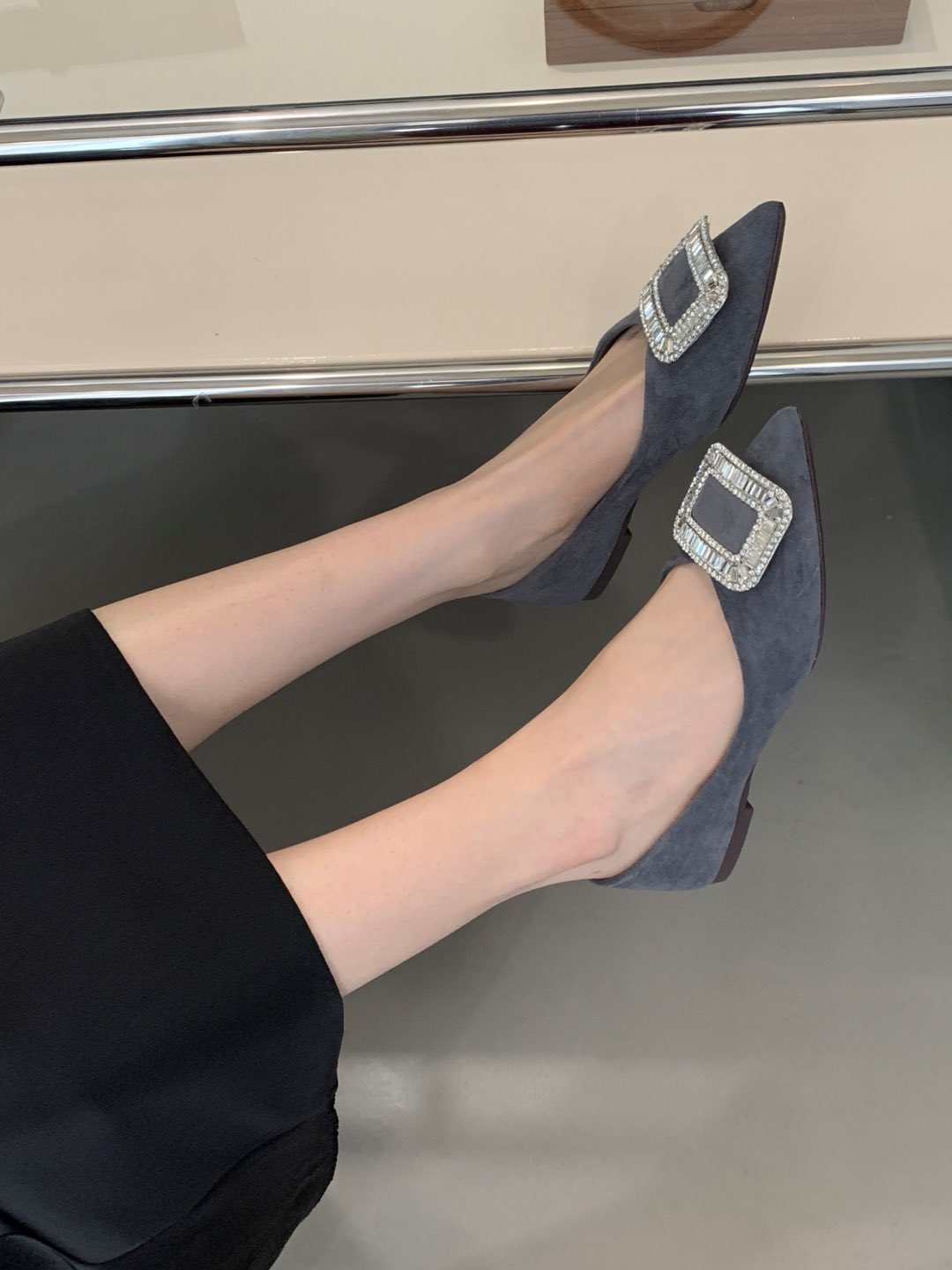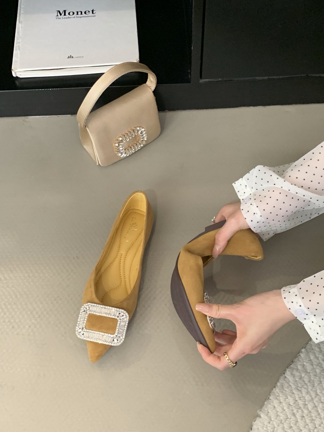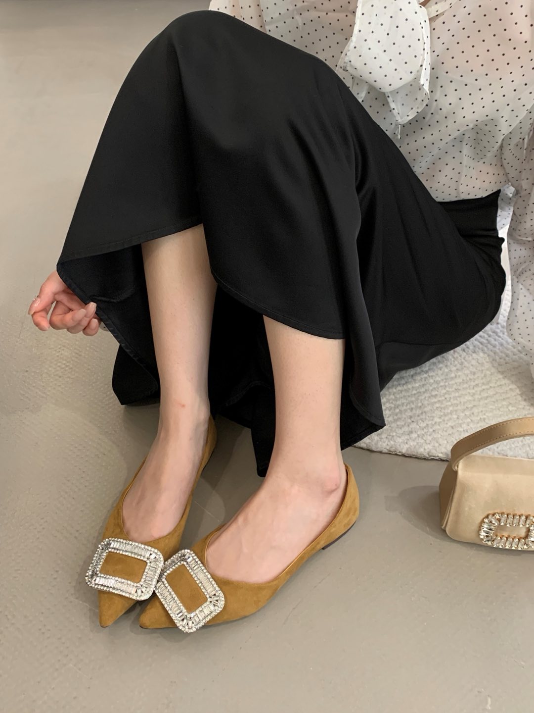 Elegant flat pointy-toe shoes adorned with rhinestones and a square buckle, perfect for a chic French-inspired commute 619-225