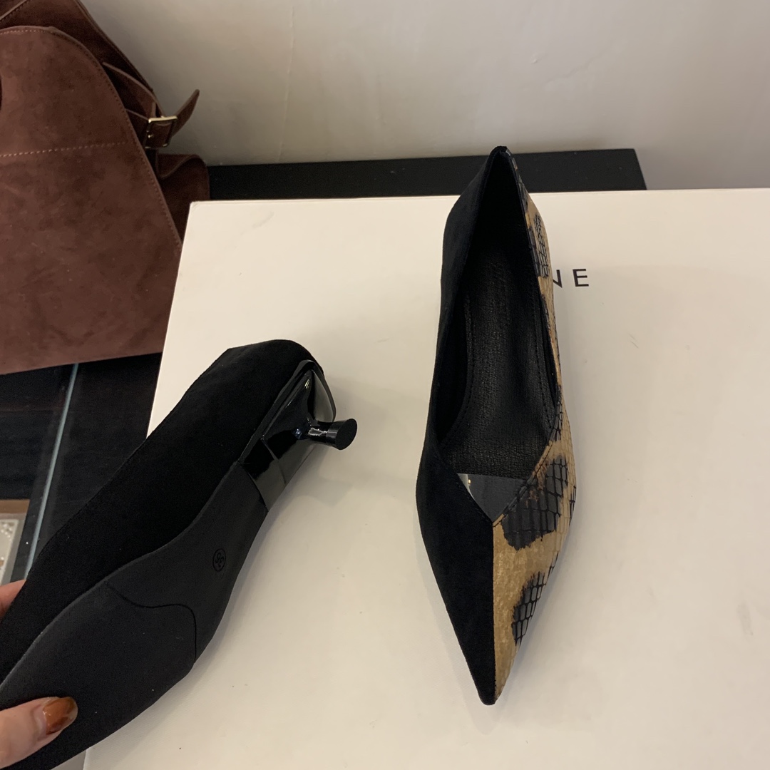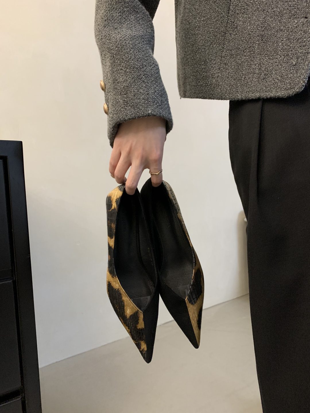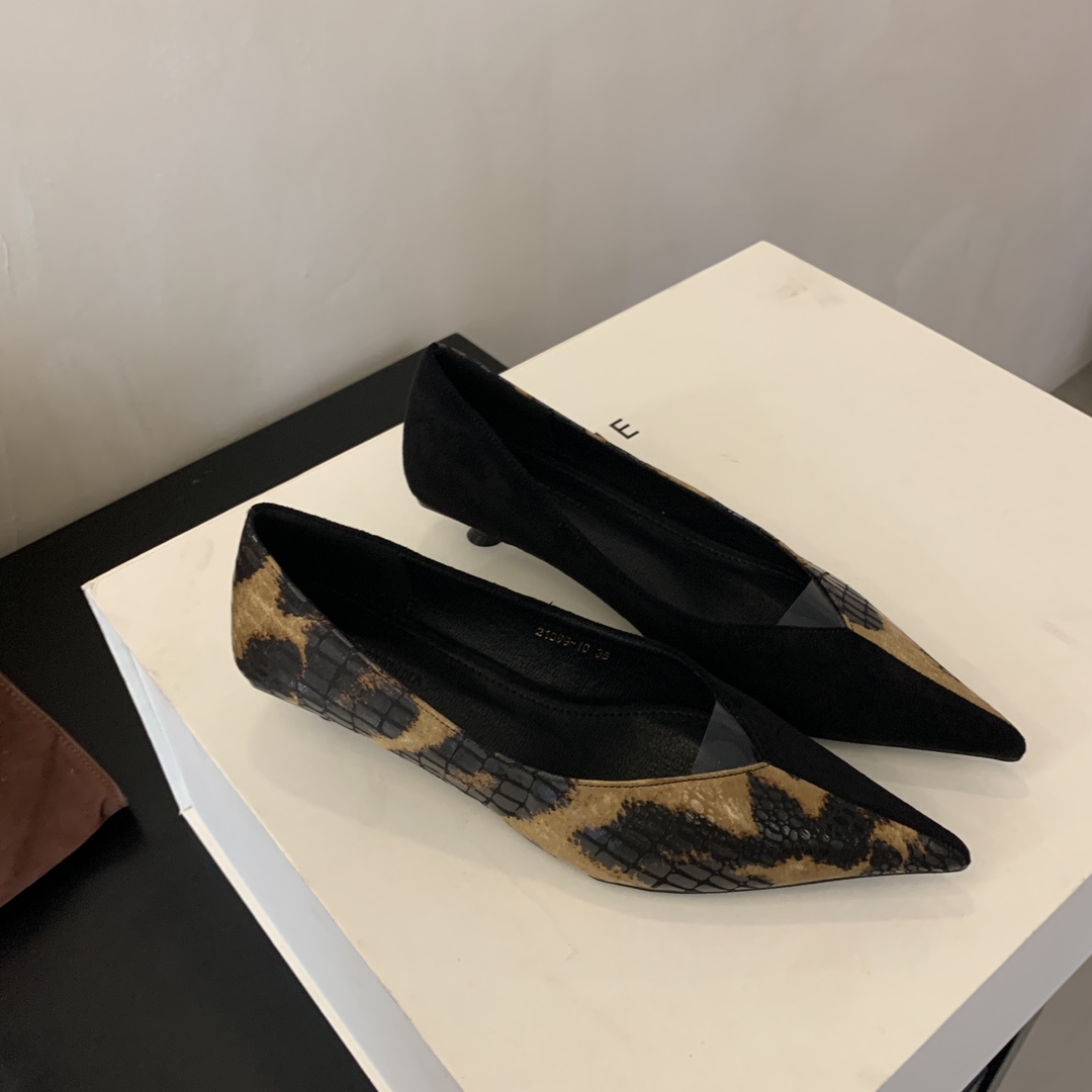 French-style pointed-toe elegant women’s single shoes with a 2cm thin heel, featuring leopard or snake print 21099-10