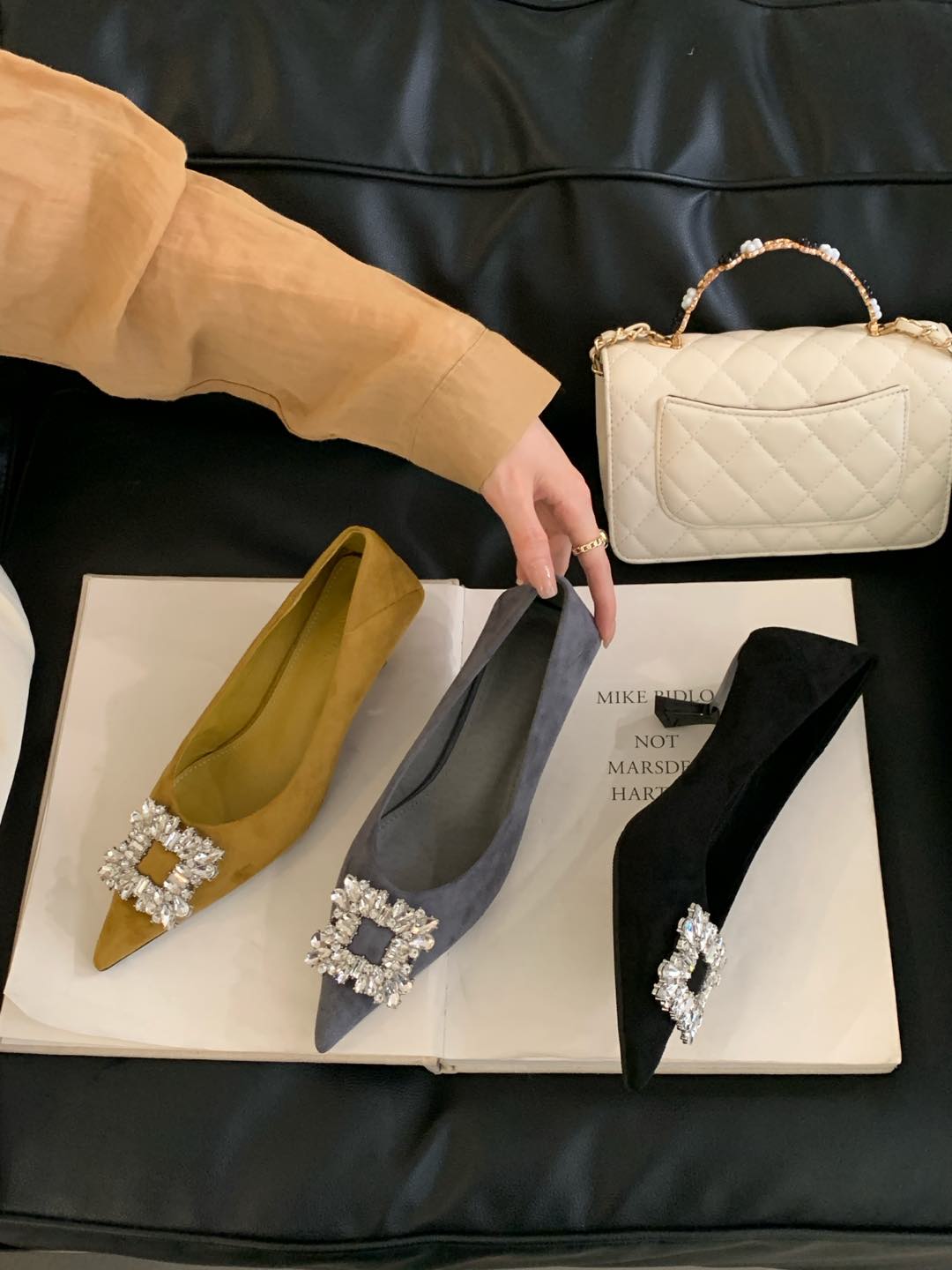 New-style versatile shoes with rhinestones, a sense of luxury, suede uppers and thin low heels.