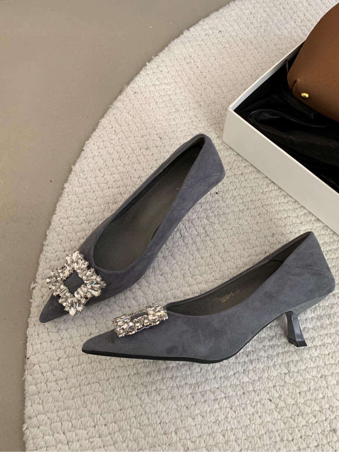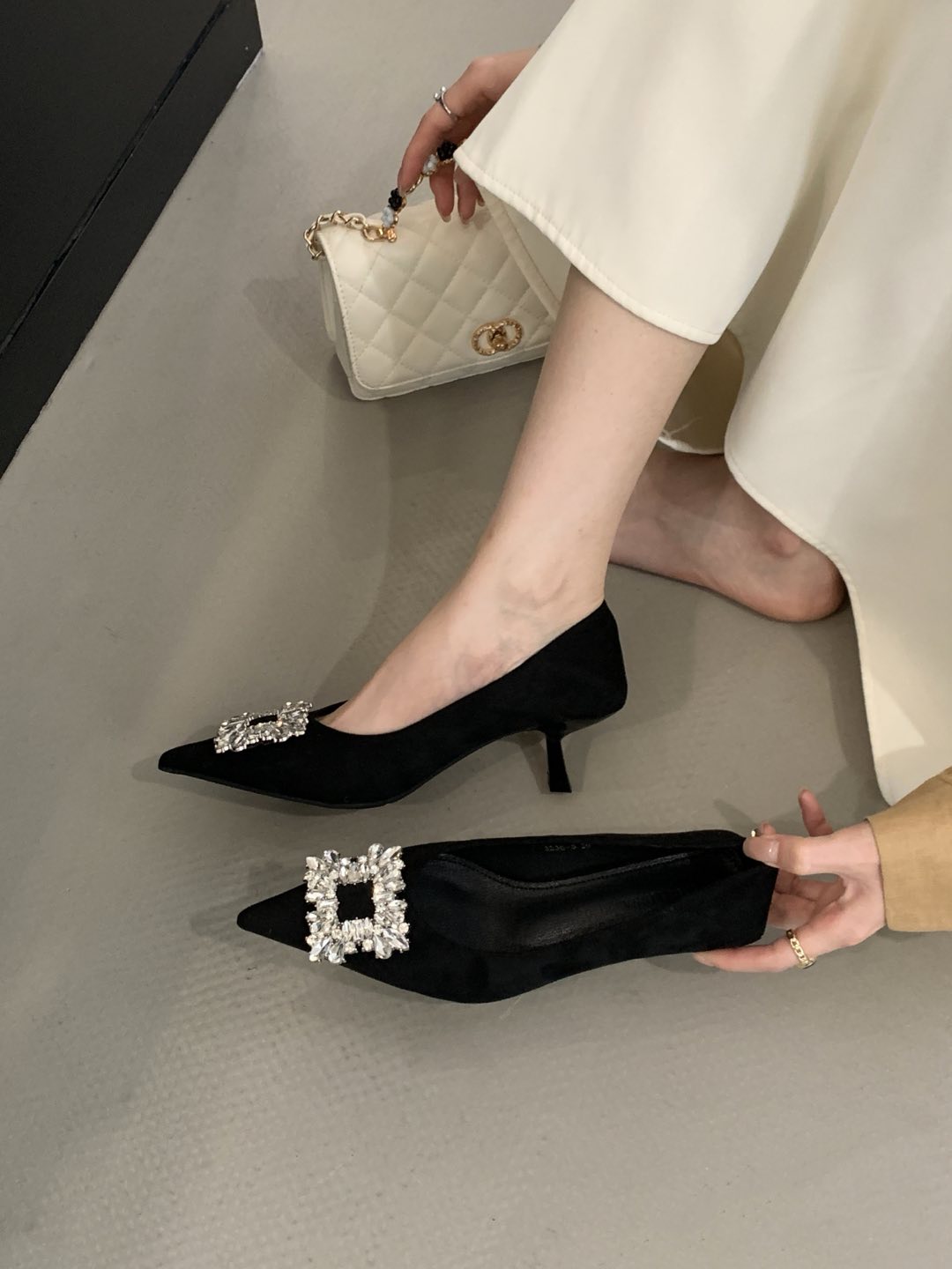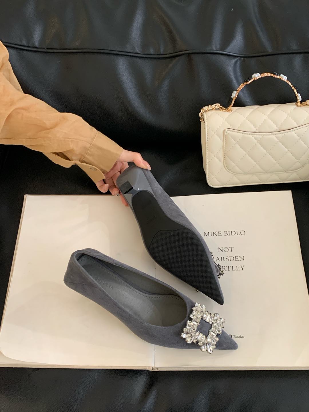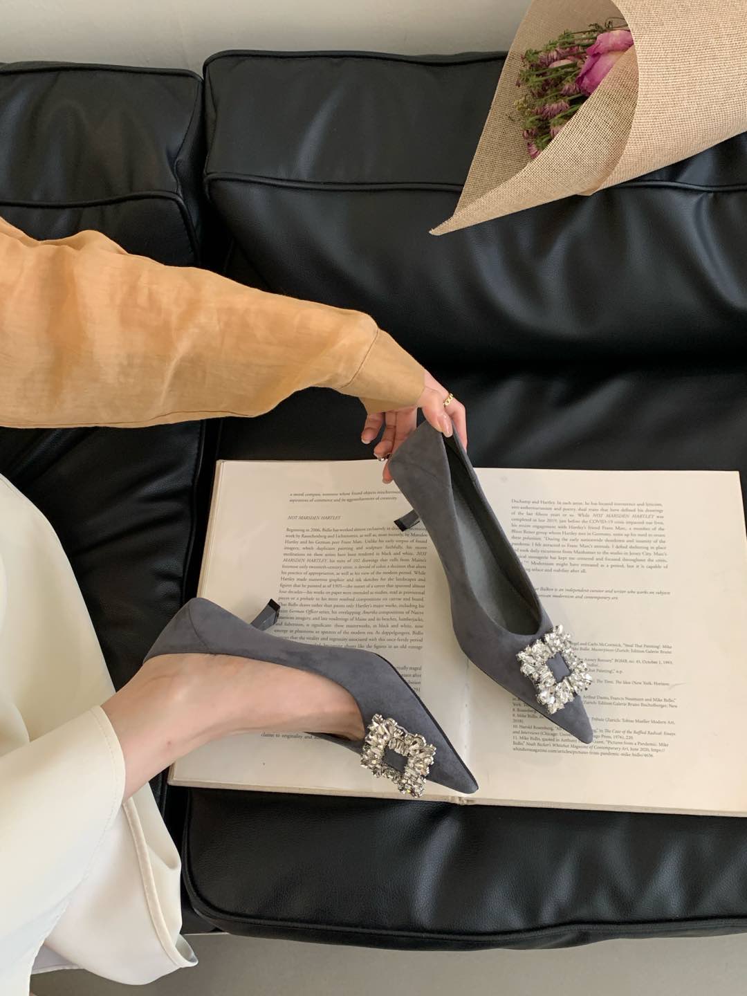 New-style versatile shoes with rhinestones, a sense of luxury, suede uppers and thin low heels.