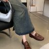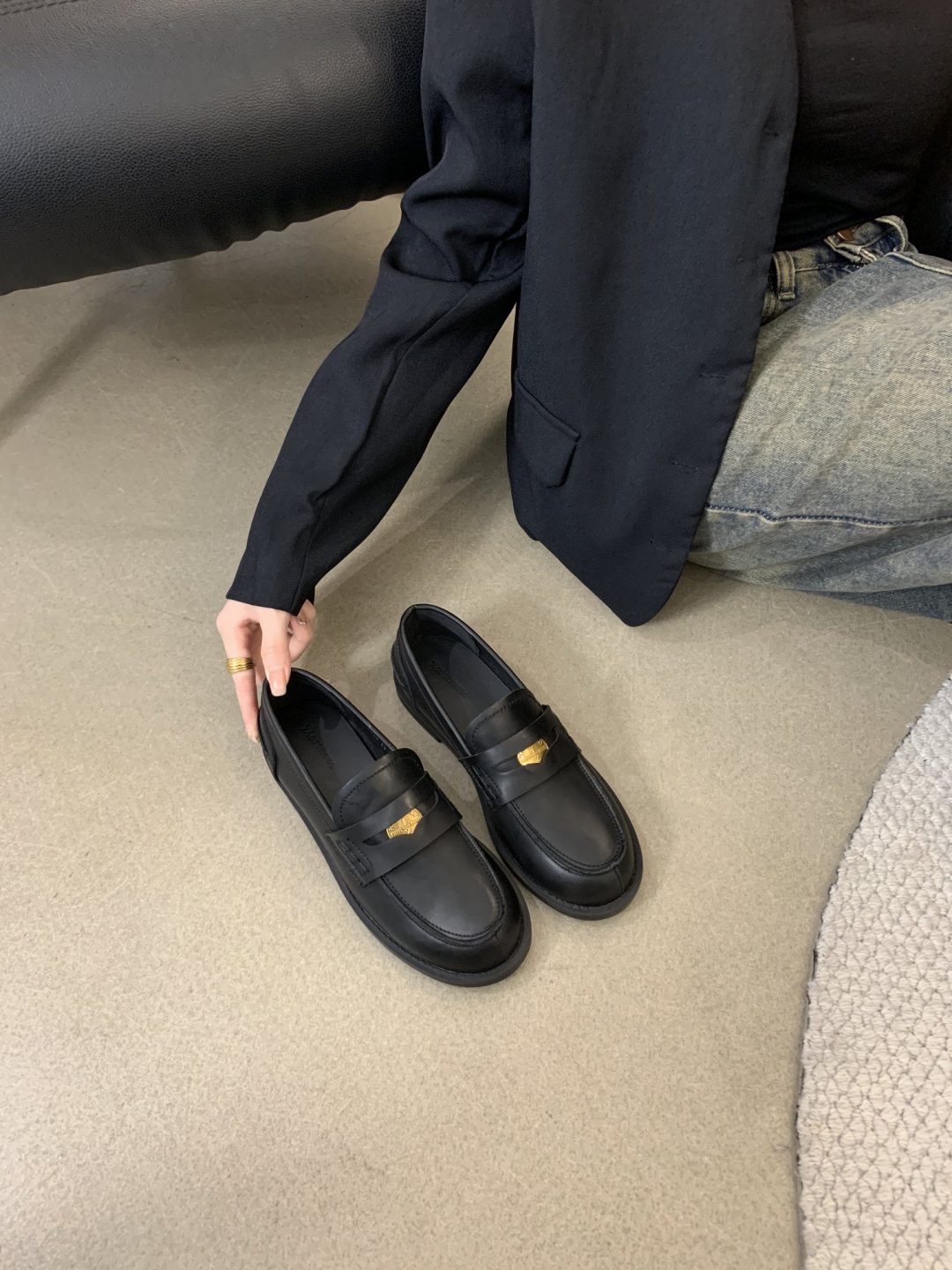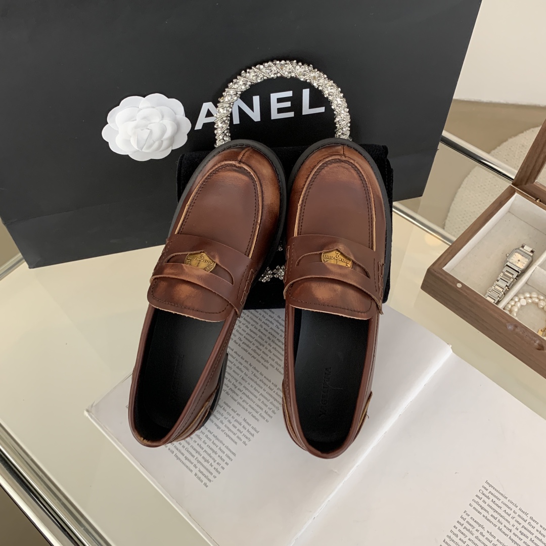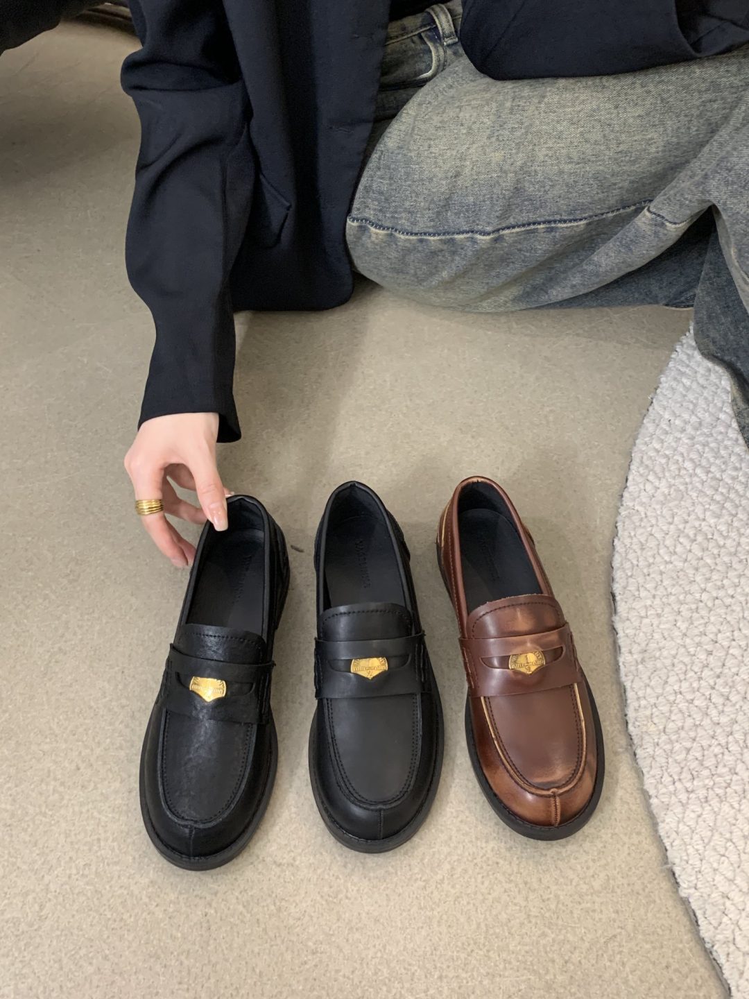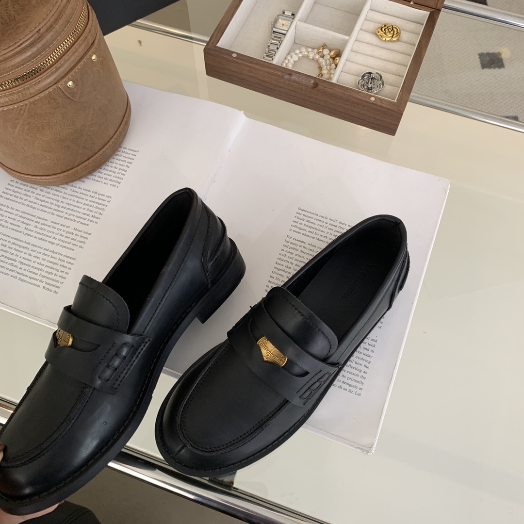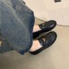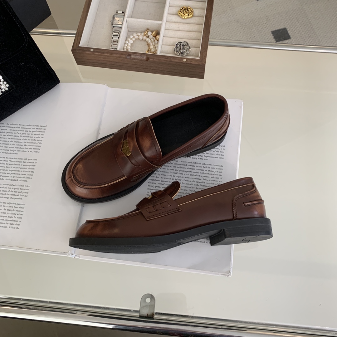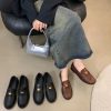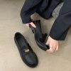 New style retro soft leather versatile casual women’s single shoes, college British-style gold-coin loafers, available in vintage brown, vintage black, and matte black.