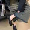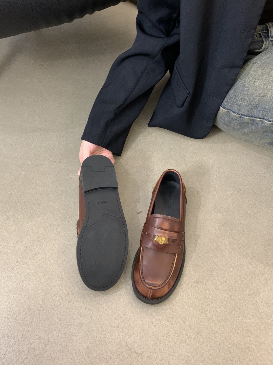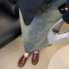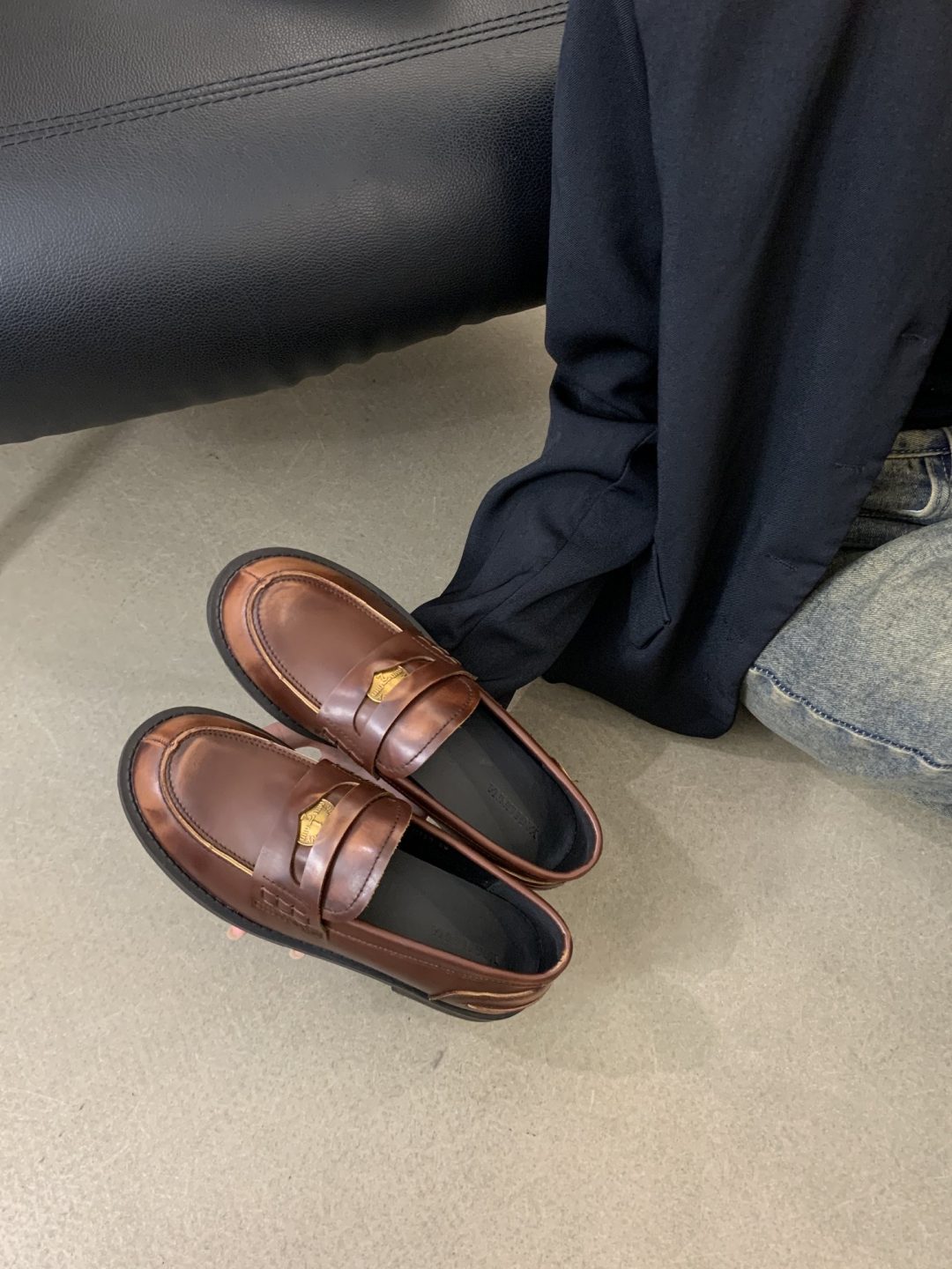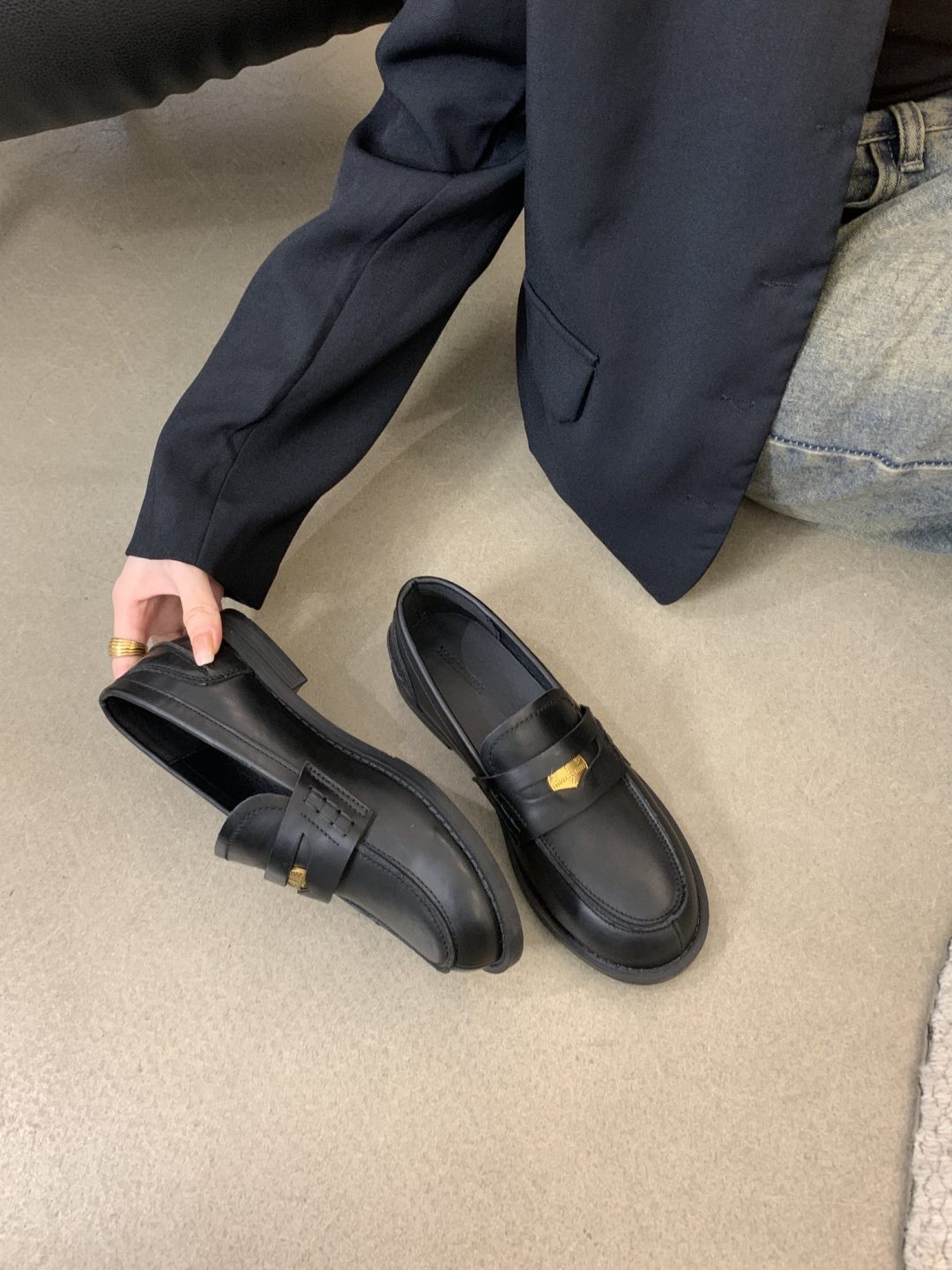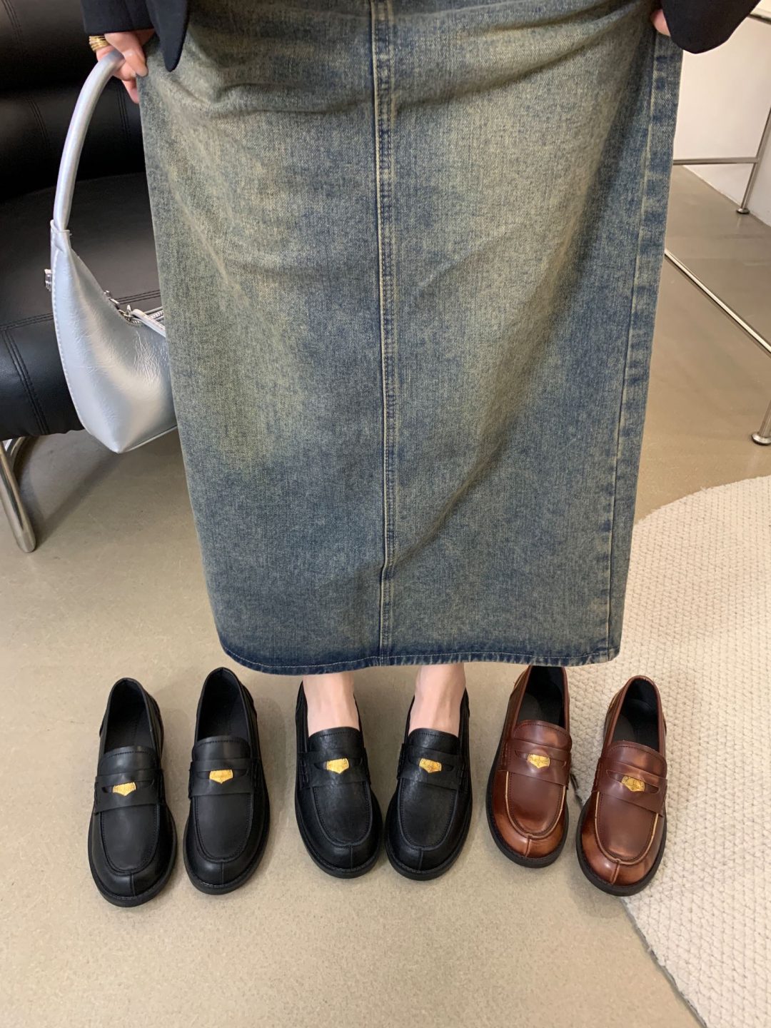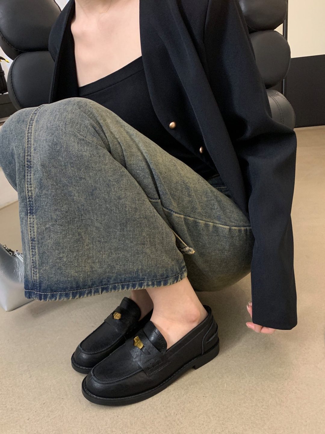 New style retro soft leather versatile casual women’s single shoes, college British-style gold-coin loafers, available in vintage brown, vintage black, and matte black.