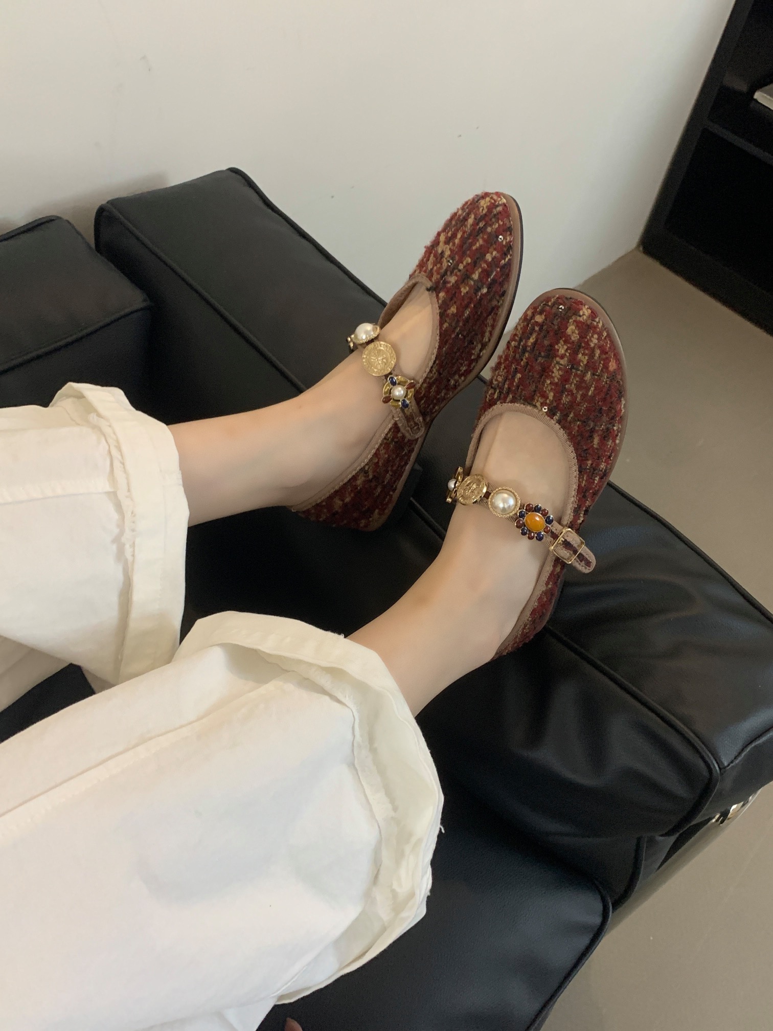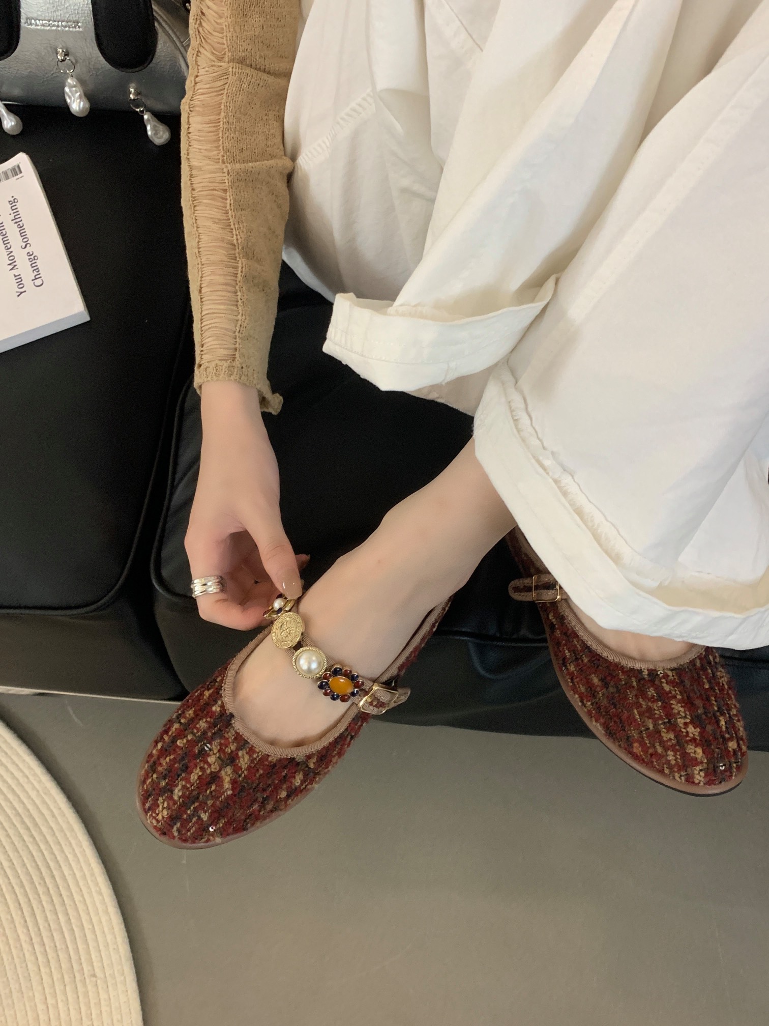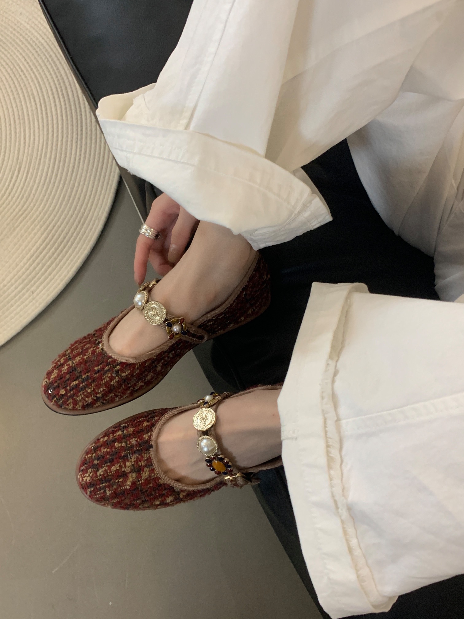 + Free ShippingWomen’s vintage flat Mary Jane shoes with a single pearl and gold coin embellished strap, featuring a camellia design.