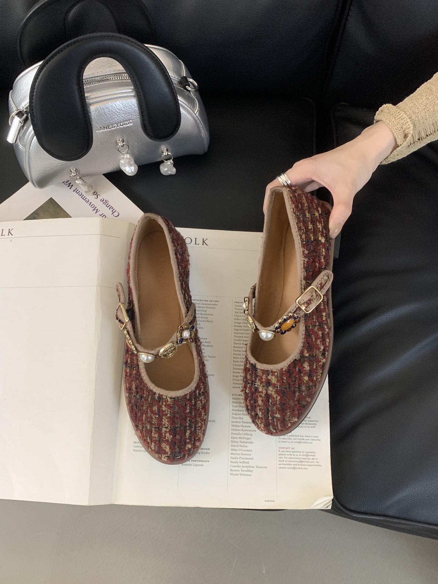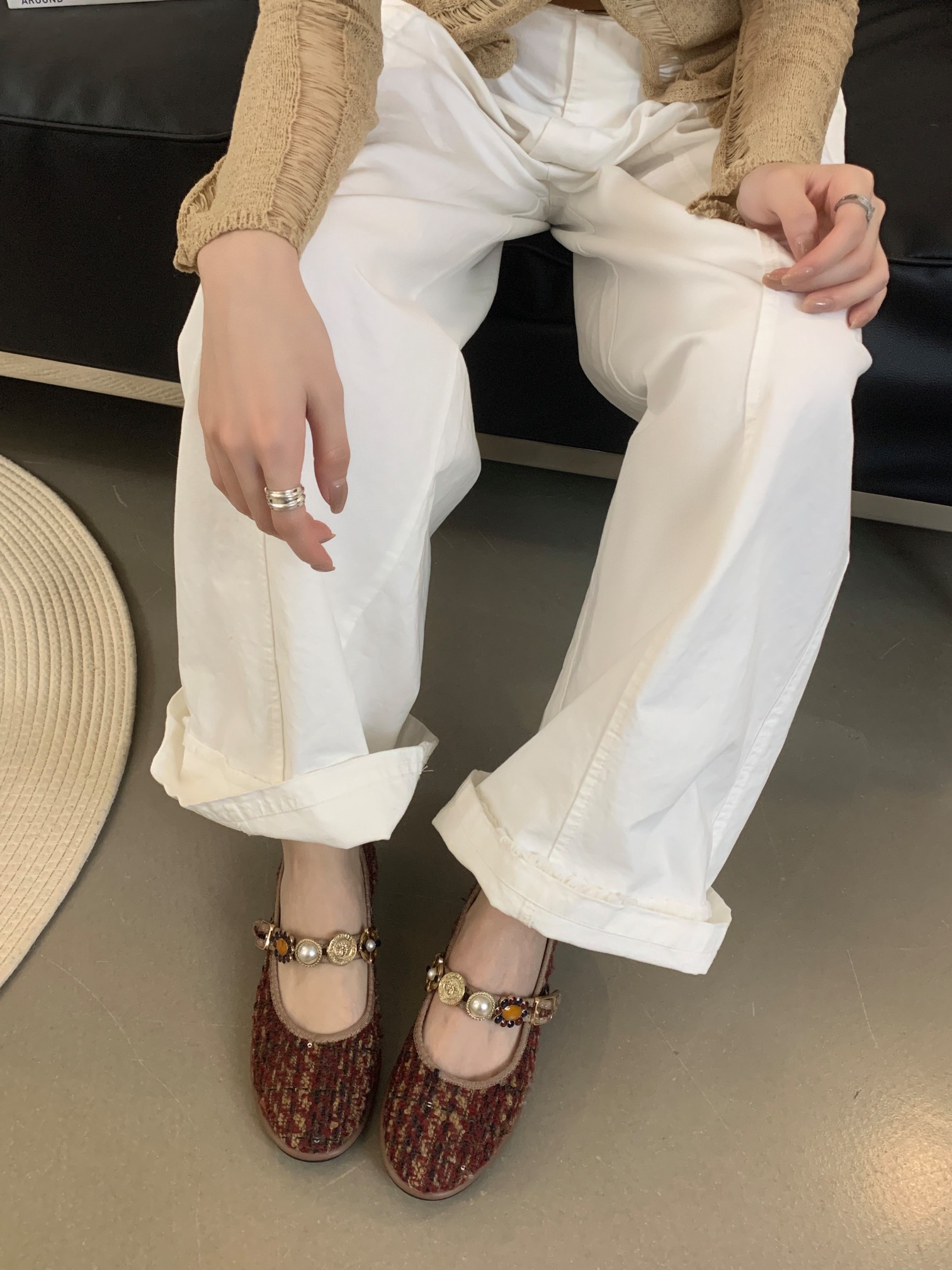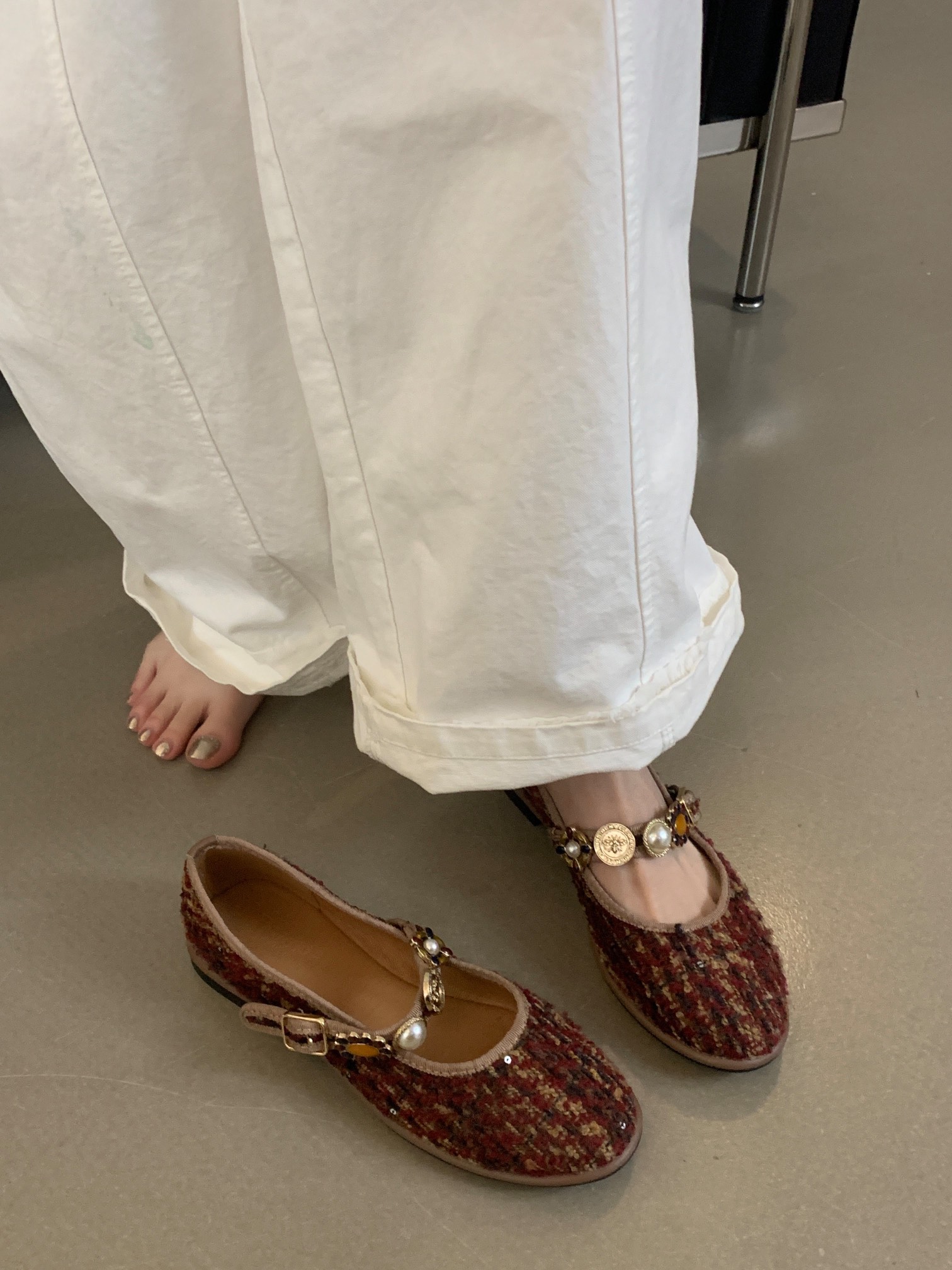 + Free ShippingWomen’s vintage flat Mary Jane shoes with a single pearl and gold coin embellished strap, featuring a camellia design.