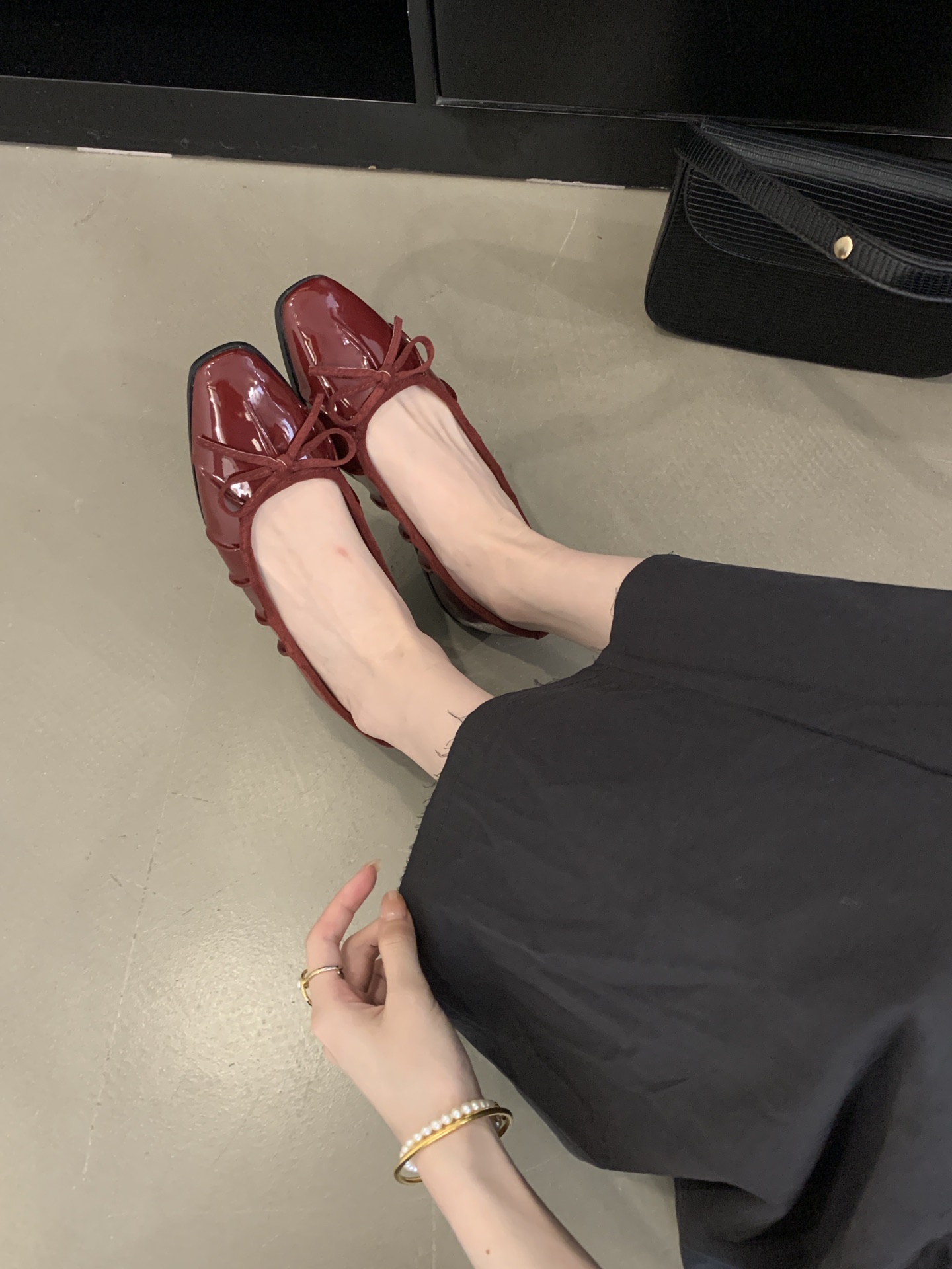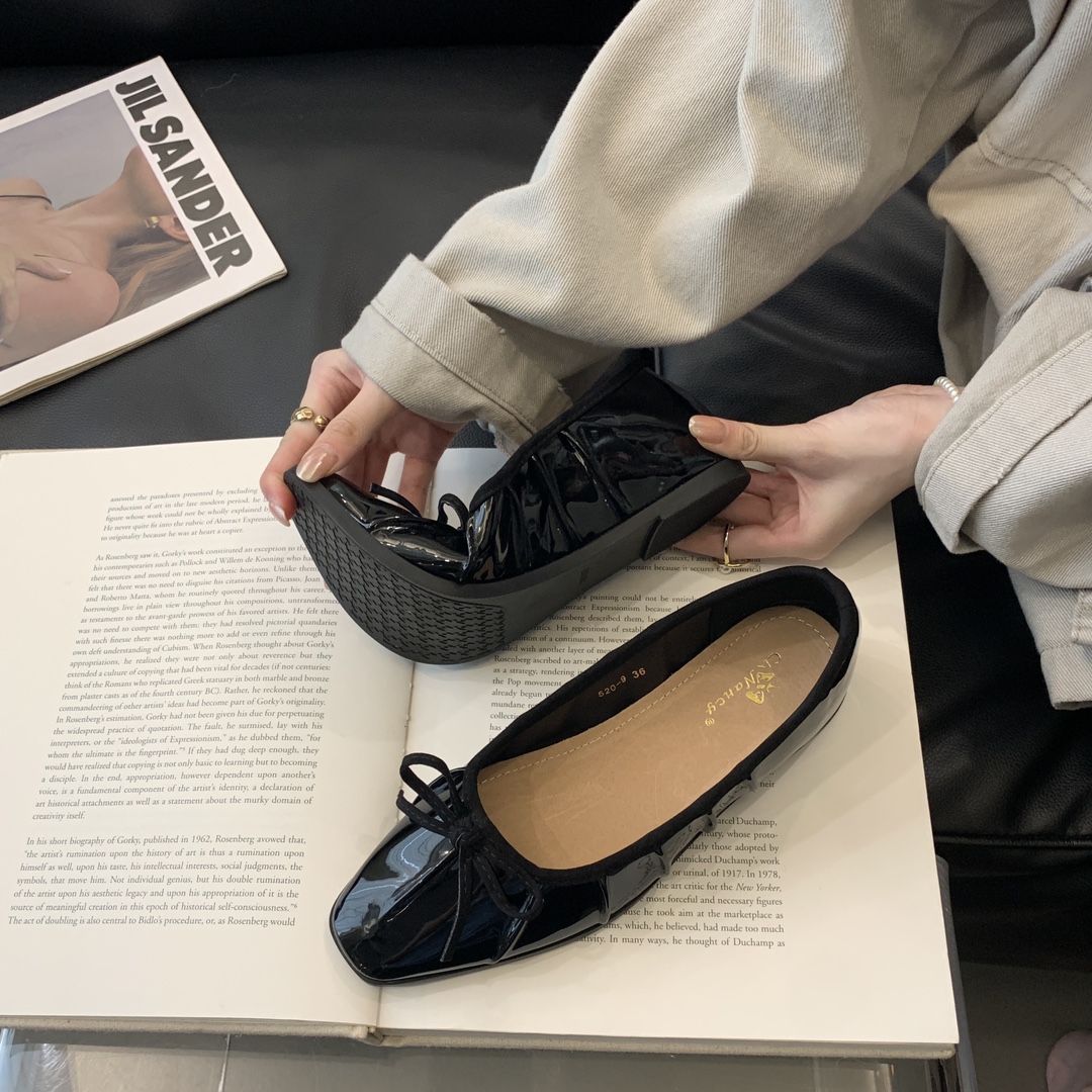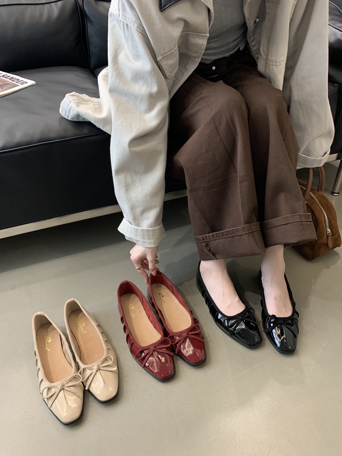 Elegant and versatile women’s shallow-cut patent leather shoes with a soft sole, square toe, bowtie decoration, and built-in heel lift.