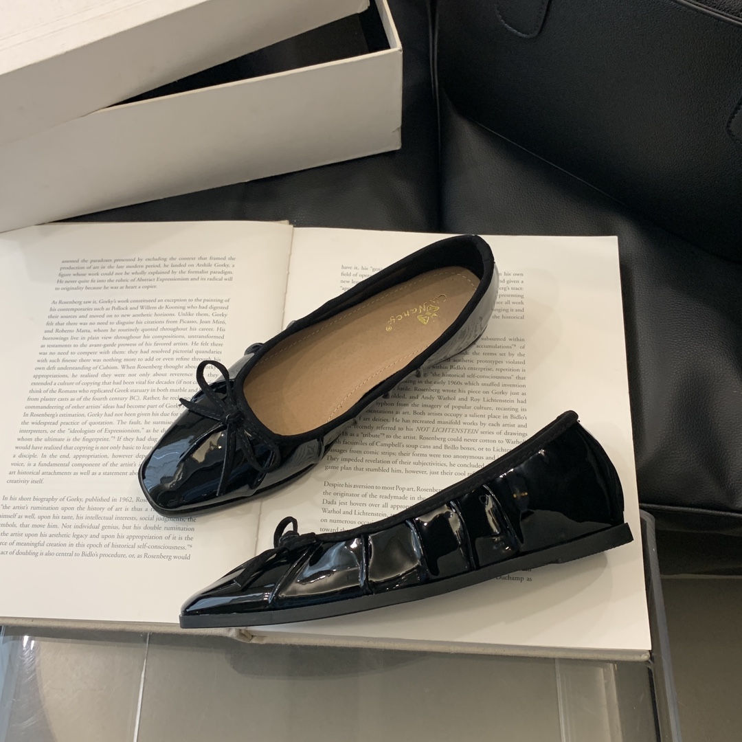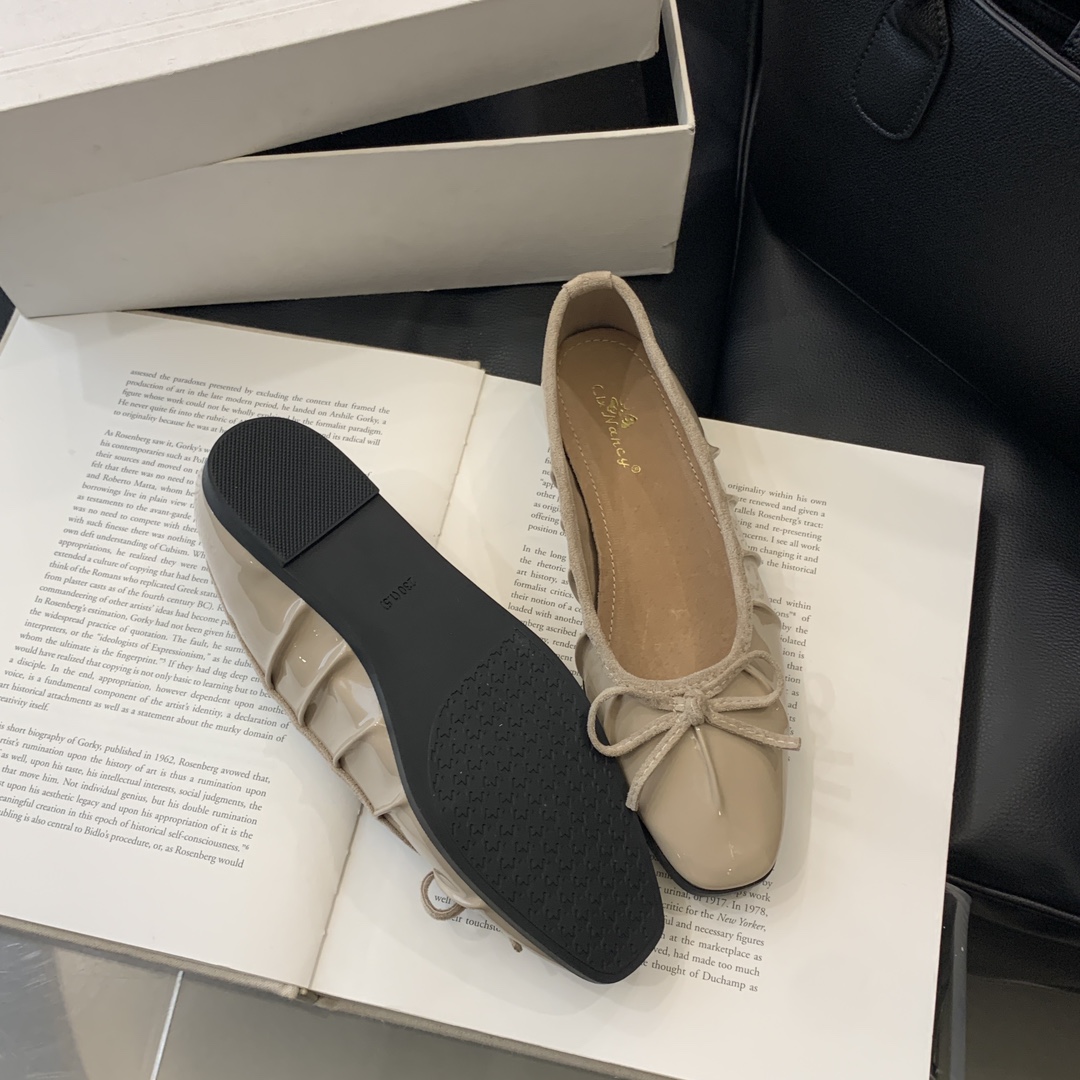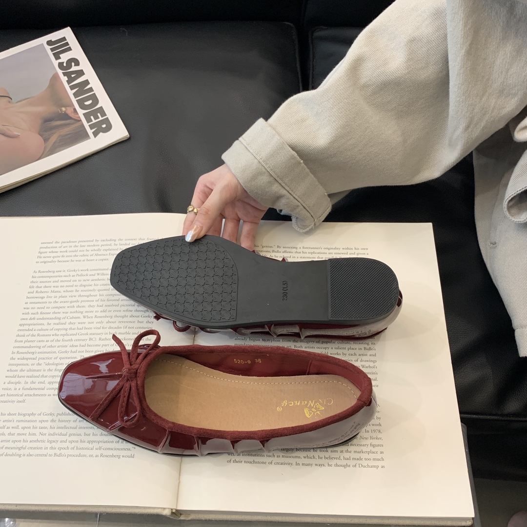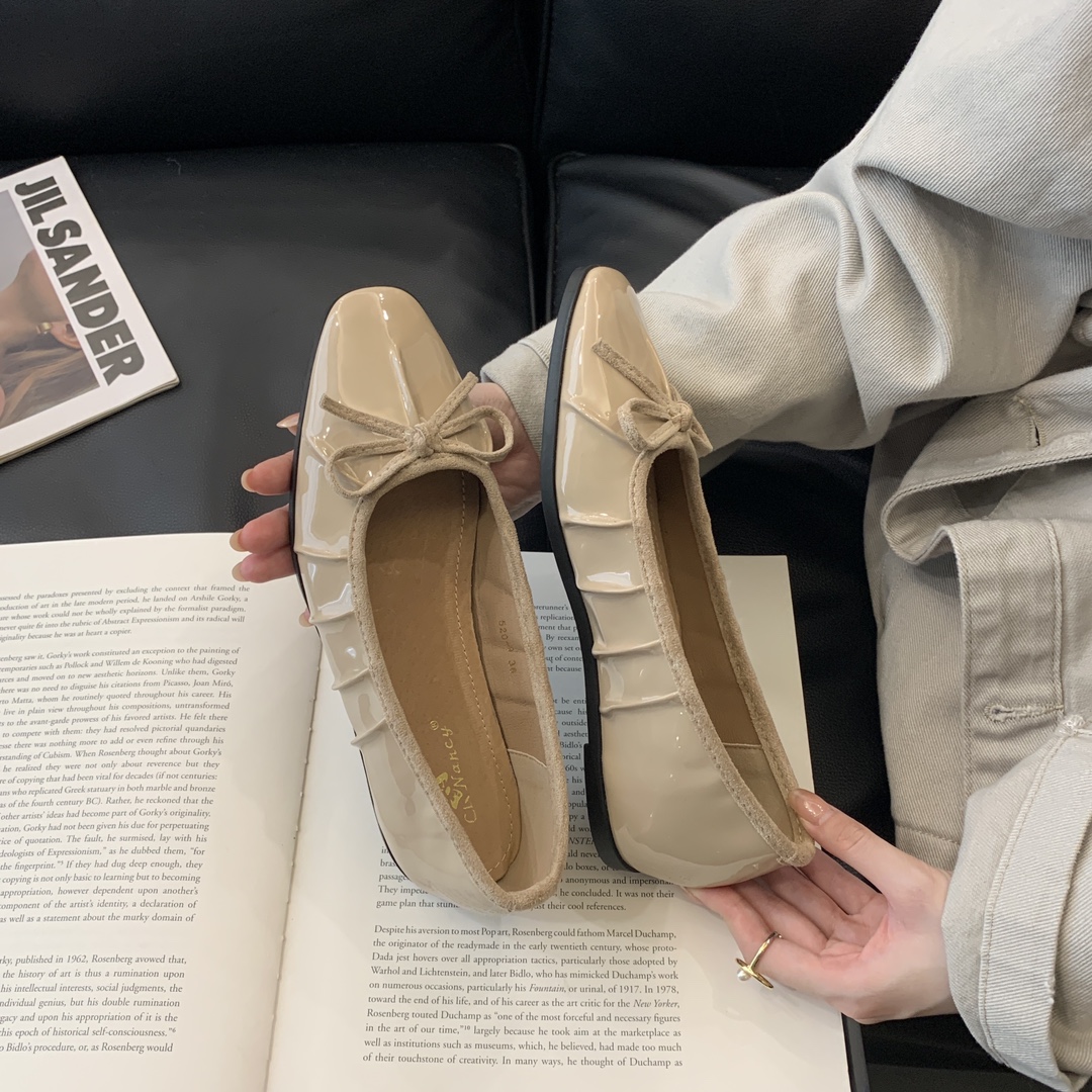 Elegant and versatile women’s shallow-cut patent leather shoes with a soft sole, square toe, bowtie decoration, and built-in heel lift.